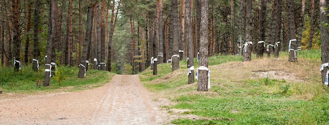 Do lasu prowadzi „czarna droga”, oznaczona biało-czarnymi palikami, zwieńczonymi krzyżem. Na polance w głębi – drugi pomnik, tym razem gigantyczna ziemna mogiła, obłożona kamieniem, z imponującym krzyżem. A wszędzie dookoła – drzewa obwiązane ukraińskimi „rucznikami”, pięknie haftowanymi na czerwono i na niebiesko. I drzewa jak pomniki, jak nagrobki, bo na nich umieszczono dziesiątki, może nawet setki tabliczek epitafijnych. Tabliczki drewniane i metalowe, z zafoliowanymi zdjęciami i porcelanowymi portretami, niczym na prawdziwych nagrobkach. Na niektórych tabliczkach tylko imię, nazwisko, daty życia. Na innych – całe życiorysy, historie rodzin. Obok tabliczek dokumenty pośmiertnej rehabilitacji niewinnie skazanych. Amatorskie wiersze. Modlitwy za ofiary i przekleństwa wobec oprawców. Głosy, głosy, głosy.